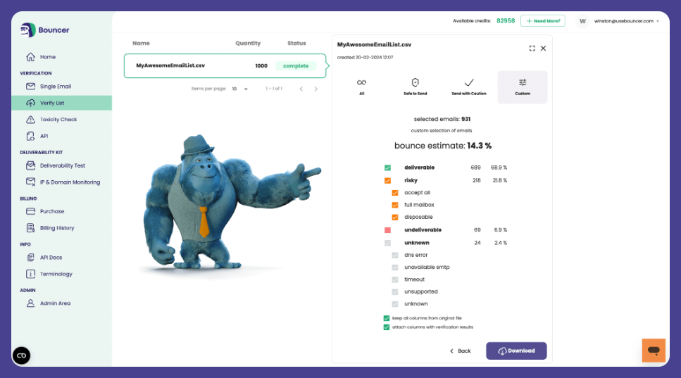 - Highest accuracy: Bouncer boasts a 99%+ accuracy rate. This means your email campaigns hit valid addresses, keeping your sender reputation intact and spam complaints low.