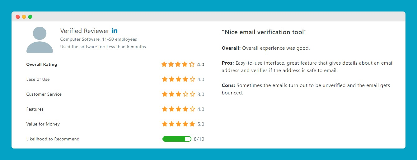 Så for dem, der ønsker at forbedre kvaliteten af deres e-mail-liste, skiller Bouncer sig ud som en pålidelig mulighed for at sikre vellykket og effektiv e-mail-opsøgende arbejde.