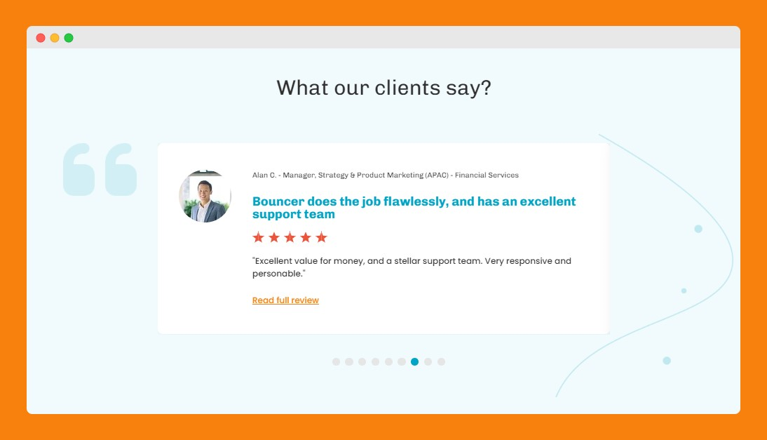 Bouncer er en platform, der kan hjælpe dig med dine kampagner. Den er nem at bruge, sikker og troværdig, som det fremgår af vores kundeanmeldelser (vi kommer til dem om lidt). Vores værktøjer til rensning af e-mail-lister finder alle ugyldige e-mail-adresser på din liste, samtidig med at brugeroplevelsen er i top.