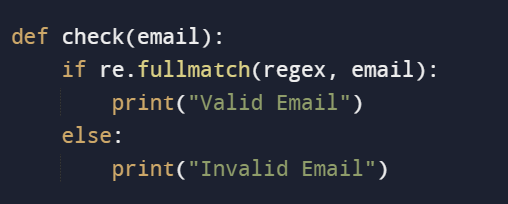 Write a helper function named “check” that uses the “re.fullmatch” command. It compares the entire email address string against your regex pattern to check any type of email address for validity.