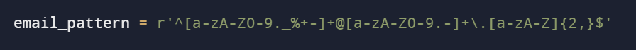 Re.match methods use Python regex to check the appearance of email addresses. It examines the user’s name, and domain name – and makes sure the email contains all the necessary elements, like the @ symbol.