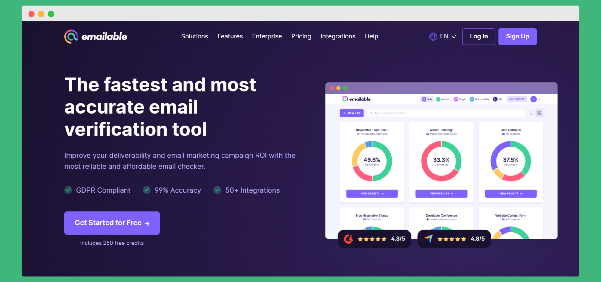Emailable ofrece servicios de entregabilidad, como informes de bandeja de entrada y supervisión de listas negras, por un coste adicional. . Pero todas las funciones básicas de verificación no tienen costes ocultos y los créditos no caducan.
