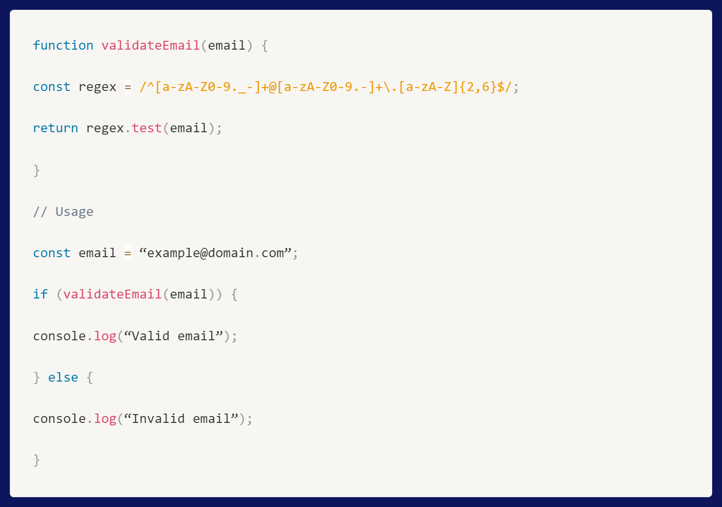 - Validación básica : La validación de correo electrónico en JavaScript se basa principalmente en patrones regex, que pueden comprobar errores básicos de formato, pero carece de capacidades de validación más profundas.