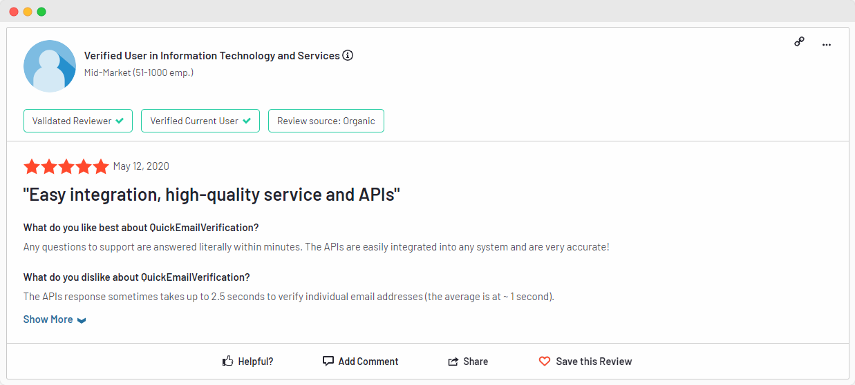 A legtöbb felhasználó viszonylag elégedett a QuickEmailVerification szolgáltatással. Az 5-ből 4,4-es általános értékeléssel rendelkezik. Ez arra utalhat, hogy a felhasználók többsége pozitív tapasztalatokat szerzett.