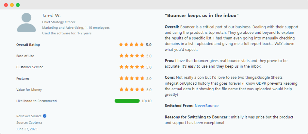 Gli alti punteggi di soddisfazione degli utenti confermano ulteriormente l’efficacia di Bouncer come servizio di verifica delle e-mail.
