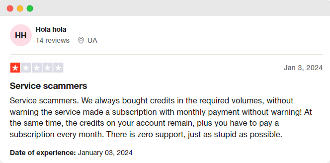 Trustpilotに掲載された以下のレビューによると、このサービスは警告なしに月払いのサブスクリプションを作り、クライアントは常に必要なボリュームのクレジットのみを購入していたとのことです。また、ZerBounceからのサポートや支援はゼロであることも強調されています。