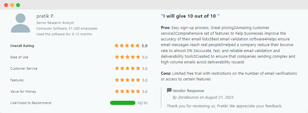 その一方で、ZeroBounceは市場に出回っている他のツールよりも単に高価であるという、シンプルで正直なレビュー(2023年)もある。しかも、精度の問題が再度強調されている。このため、ソフトウェアの評価は星4つに下がった。