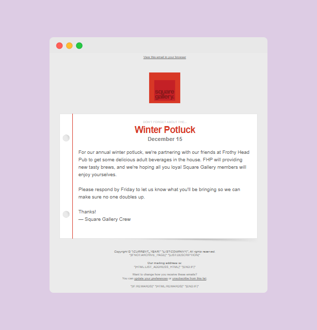 簡単に編集して使えるレスポンシブメールテンプレートを使って、今年も次の休日も思い出に残るものにしましょう: