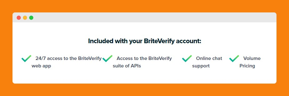 BriteVerify 는 Validity에서 제공하는 대량 이메일 검증 도구입니다.이 이메일 목록 정리 서비스는 유효하지 않은 데이터가 이메일 데이터베이스에 입력되는 것을 방지하여 이메일 주소의 정확성과 신뢰성을 보장하는 데 중점을 둡니다.