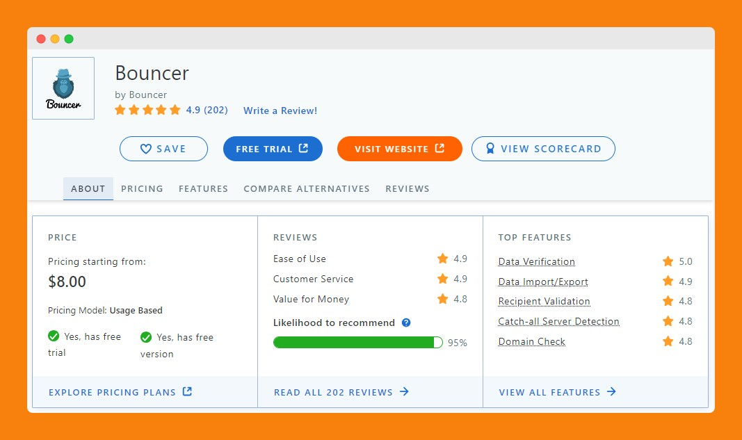 깨끗하고 정확한 이메일 목록을 유지하는 것은 이메일 마케팅 캠페인을 개선하고 메시지가 의도한 수신자에게 도달할 수 있도록 하려는 기업에게 매우 중요합니다. 이메일 확인 및 전달 가능성 측면에서 Bouncer는 최상위 옵션으로 돋보입니다.