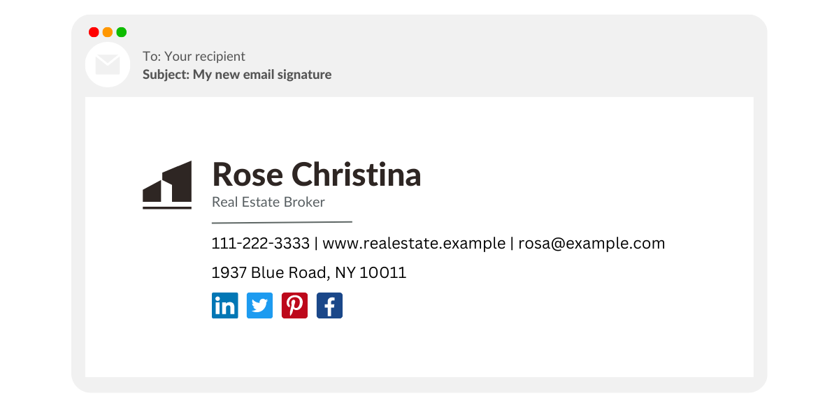 다음은 이메일에 새 서명을 만드는 데 사용할 수 있는 이메일 서명 템플릿입니다. 이 샘플 이메일 서명을 잘 디자인된 이메일 서명의 지표로 사용하세요.