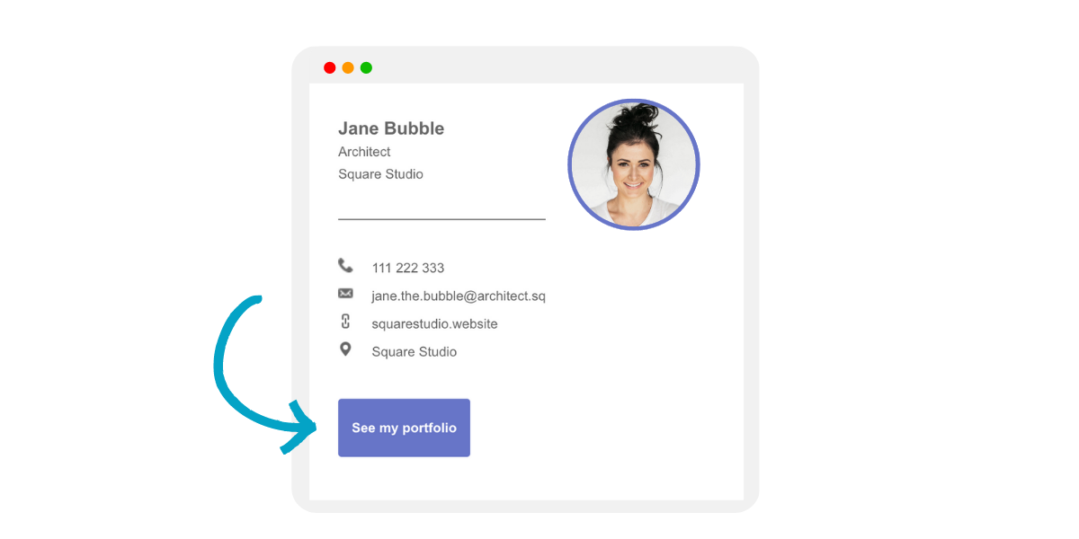 그래픽 디자이너는 종종 시각적인 요소를 만들어야 하므로 이메일 서명이 자신의 작품을 보여줄 수 있는 장소가 됩니다. 그래픽 디자이너(또는 다른 창의적인 일을 하는 사람)가 서명을 만들고 싶다면 서명할 때 포트폴리오 CTA를 추가하는 것을 잊지 마세요.