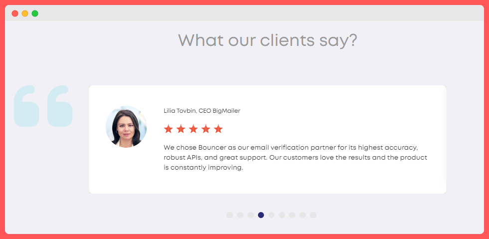 - 간편한 통합 및 사용 : Bouncer는 사용자 친화적인 인터페이스를 갖추고 있어 기존 도구와 원활하게 통합할 수 있습니다. 이러한 통합을 통해 자주 사용하는 마케팅 플랫폼 내에서 바로 이메일 목록을 간편하게 정리할 수 있습니다.