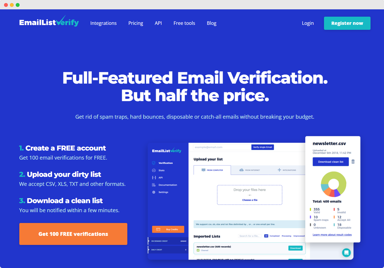 EmailListVerify is an email list cleaning software that assists businesses in maintaining healthy lists. You can use it to get rid of spam traps, hard bounces, or catch-all email addresses.