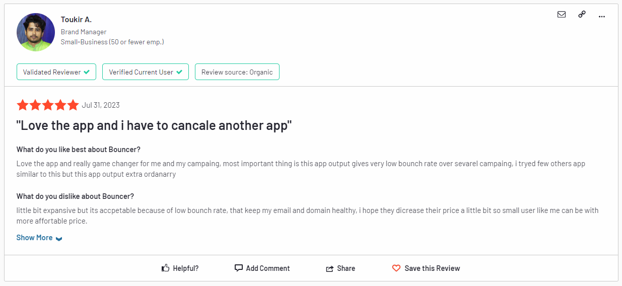 However, according to our users’ opinions on platforms like G2 or Capterra, Bouncer has no significant drawbacks. On the contrary, it has high user reviews.