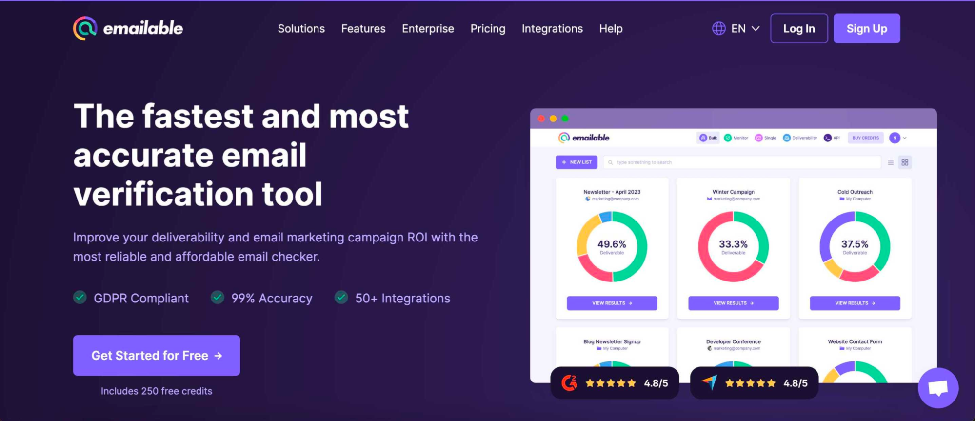 GDPR과 같은 글로벌 규정을 준수하고 강력한 암호화를 사용하여 데이터를 보호합니다. 100개의 이메일 인증이 무료로 제공되므로 더 잘 판단할 수 있습니다.
