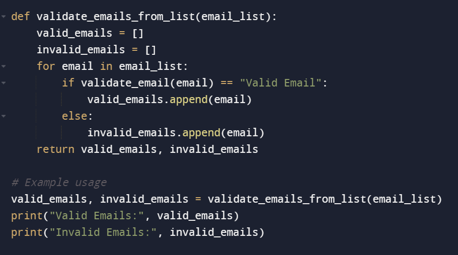 Powyższy kod kategoryzuje wiadomości e-mail na prawidłowe i nieprawidłowe listy i wyraźnie pokazuje, które wiadomości e-mail przeszły test walidacji.