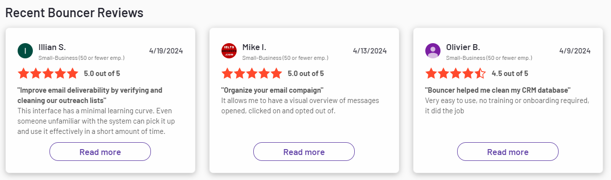 - Beatriz F. :” O Bouncer é um serviço que tornou a verificação de e-mails muito fácil de usar, desde o envio de uma lista completa até uma única verificação por vez. Sei que os resultados finais são confiáveis e não me decepcionarão. Com sua ajuda, sei quais e-mails posso usar com segurança em minhas campanhas e quais não podem.”