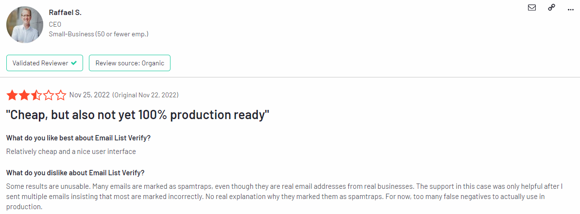 O EmailListVerify às vezes identifica endereços de e-mail reais e ativos como armadilhas de spam, o que leva a falsos negativos. Isso pode ser um grande problema, pois significa que alguns endereços de e-mail legítimos são marcados incorretamente e não são usados em campanhas de e-mail.