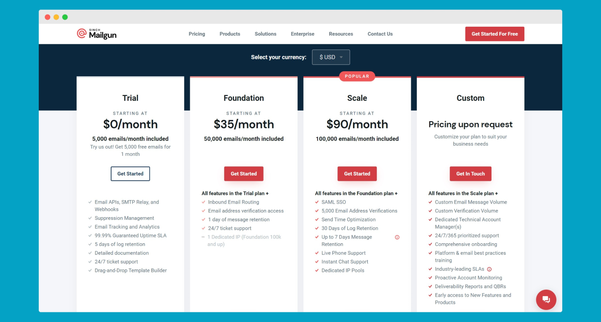O Mailgun tem vários planos de preços com base em o número de e-mails enviados.