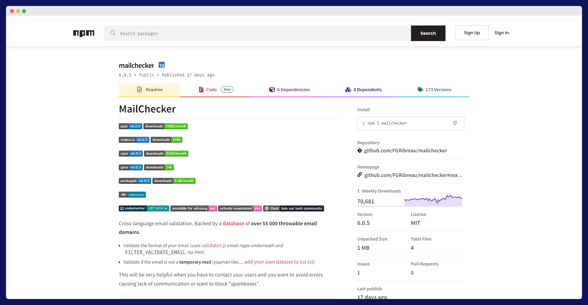 O MailChecker é uma ferramenta útil para verificar endereços de e-mail e melhorar a capacidade de entrega de e-mails. Ele verifica se os endereços de e-mail estão formatados corretamente usando Regex e identifica e-mails descartáveis comparando-os com um grande banco de dados de domínios descartáveis conhecidos.