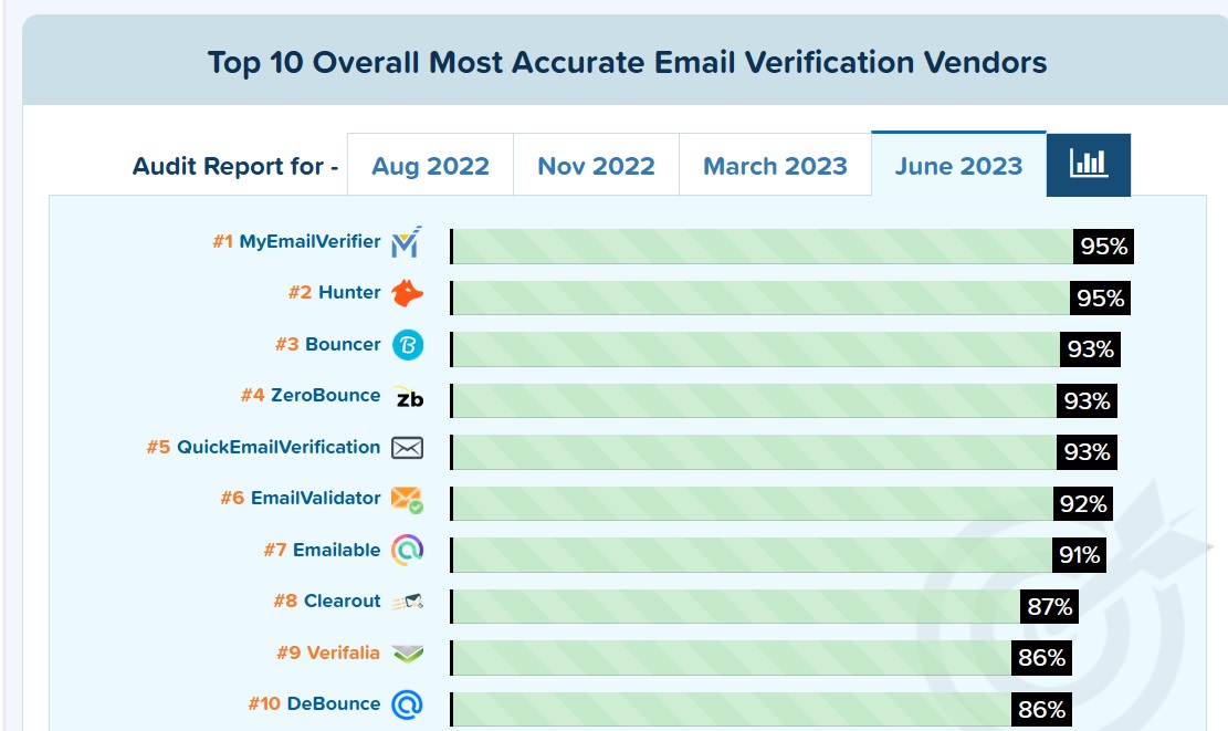 Listă Sfaturi de curățare Comparația serviciilor de verificare a e-mailurilor pentru iunie 2023 plasează Verifalia pe locul zece, cu 86% precizie. Bouncer, între timp, în același clasament, ocupă locul trei cu 93% precizie în clasamentul din iunie 2023 și 97% în martie 2023.