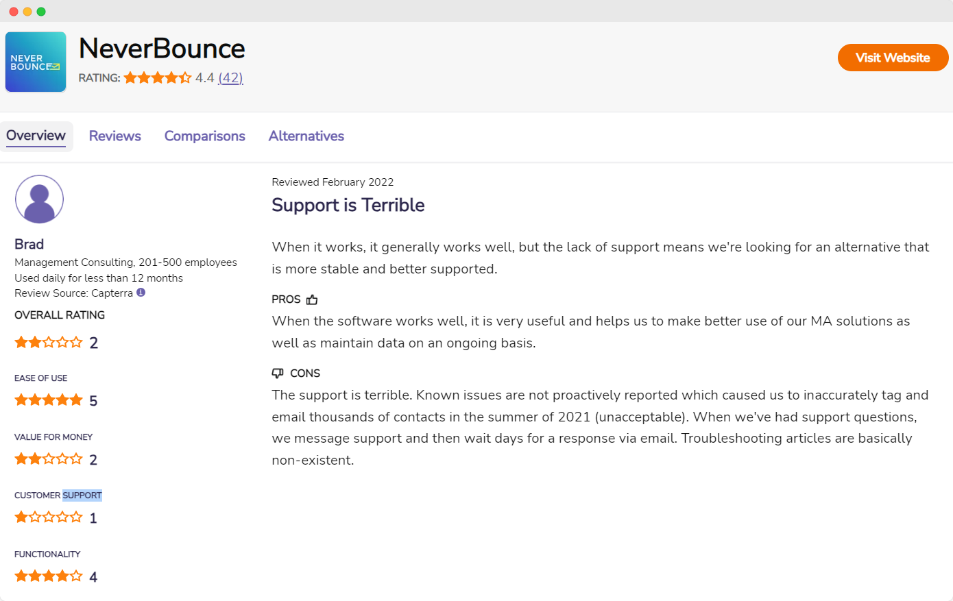 Хотя NeverBounce предлагает надежные услуги проверки электронной почты, некоторые пользователи сообщают о проблемах с точностью и поддержкой клиентов.
