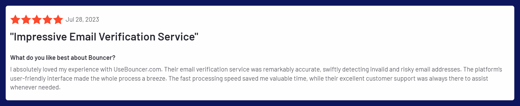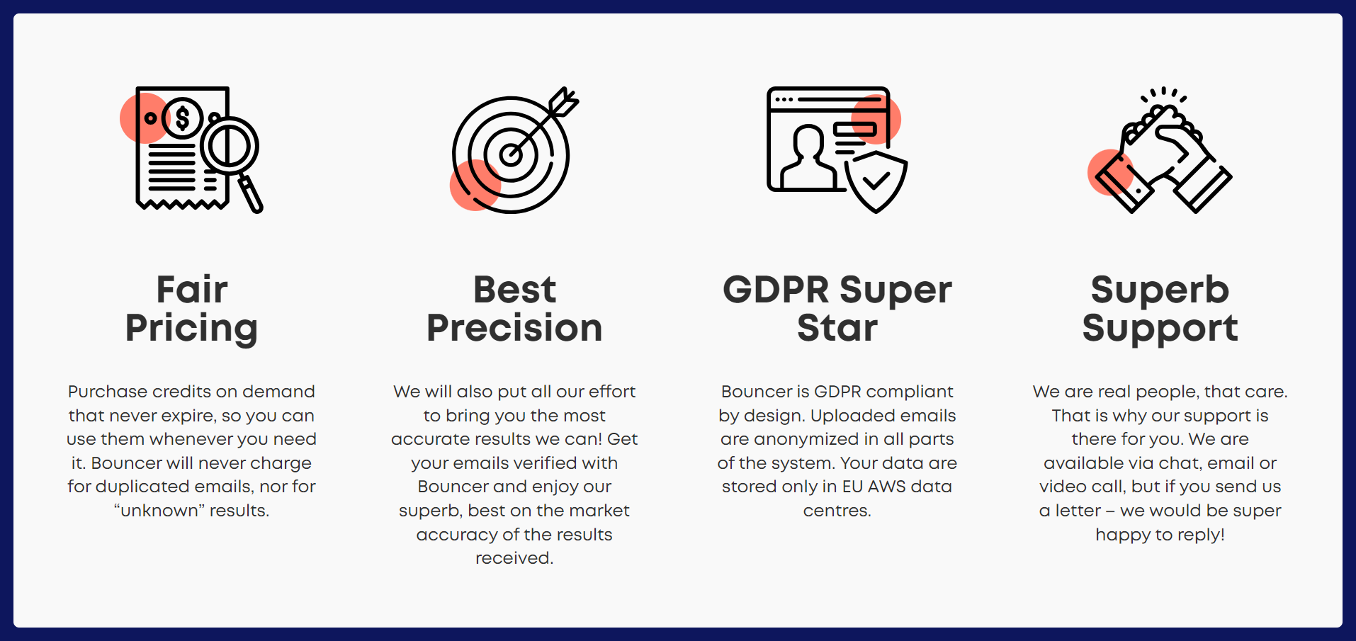 Bouncer відомий своєю високою точністю. Він ретельно перевіряє адреси електронної пошти, щоб переконатися, що вони дійсні, а не просто тимчасові або одноразові.