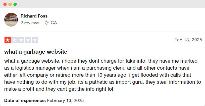 💬 Review: “What a garbage website. I hope they don’t charge for fake info. They have me marked as a logistics manager when I am a purchasing clerk. And all other contacts have either left the company or retired more than 10 years ago.” — Richard Foss, CA