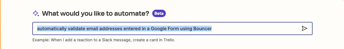 #2 您可以使用 Zapier 的人工智能创建器为您制作 Zap . 键入你想要做的事情:”使用 Bouncer 自动验证在 Google 表单中输入的电子邮件地址